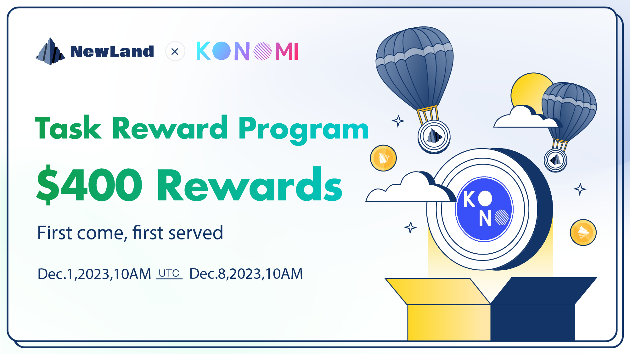 �Exciting news! We are pleased to announce that NewLand has reached a strategic cooperation with Konomi Network. To celebrate, we will be hosting a Task Reward Program with a total reward pool of $400. Start the task now and start earning tokens and points 🚀